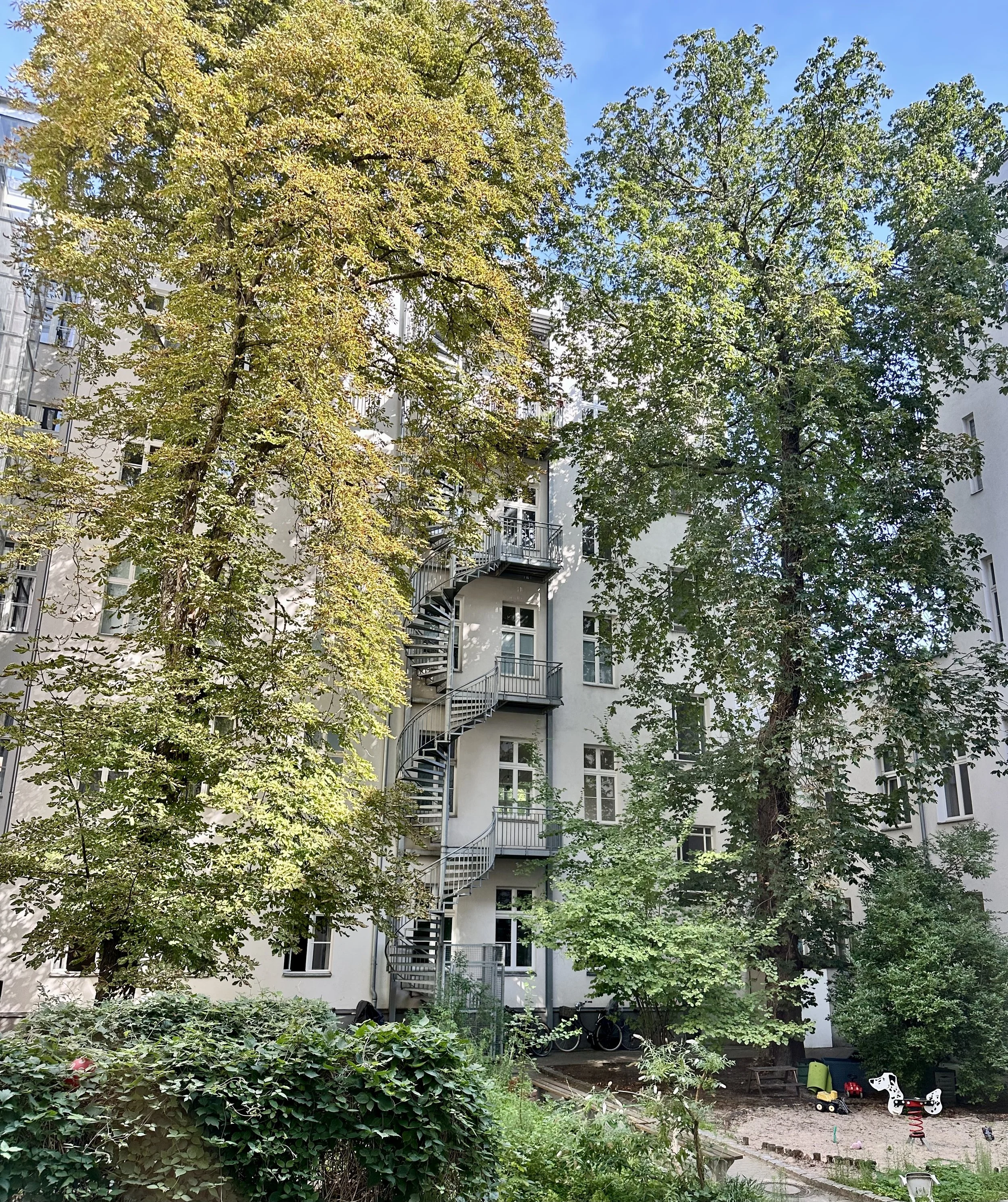 The core of the building, framed by chestnut trees and greenery. A gentle meeting point between rooms, morning breakfasts, and the everyday flow of Berliners.